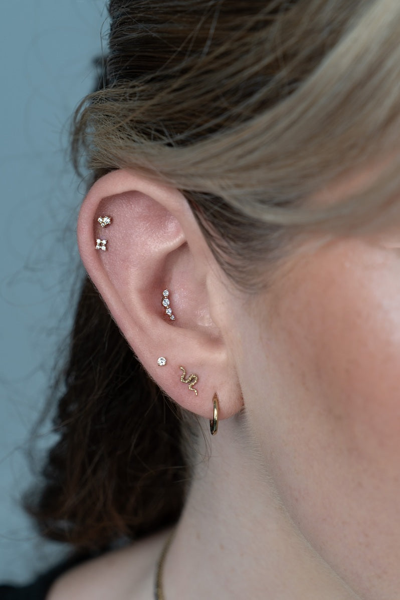 Ear curation is so much more than simply popping in a few piercings. It’s about taking the time to style your ear with multiple piercings and complementary jewellery. Unlike a standard ear piercing, where you choose a single placement, ear curation balances different piercing locations and jewellery styles to create a cohesive look that is unique to you.