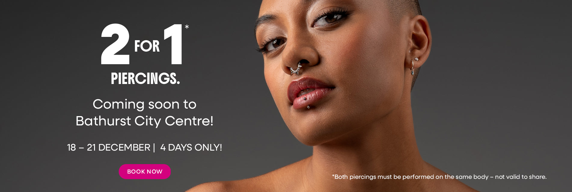 You’ll pay a piercing fee plus the cost of your preferred jewellery. We have options to suit every budget, so you can find something perfect without breaking the bank! Our most popular deal is 2 for $80.