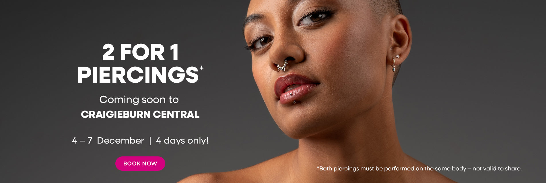 You’ll pay a piercing fee plus the cost of your preferred jewellery. We have options to suit every budget, so you can find something perfect without breaking the bank! Our most popular deal is 2 for $80.